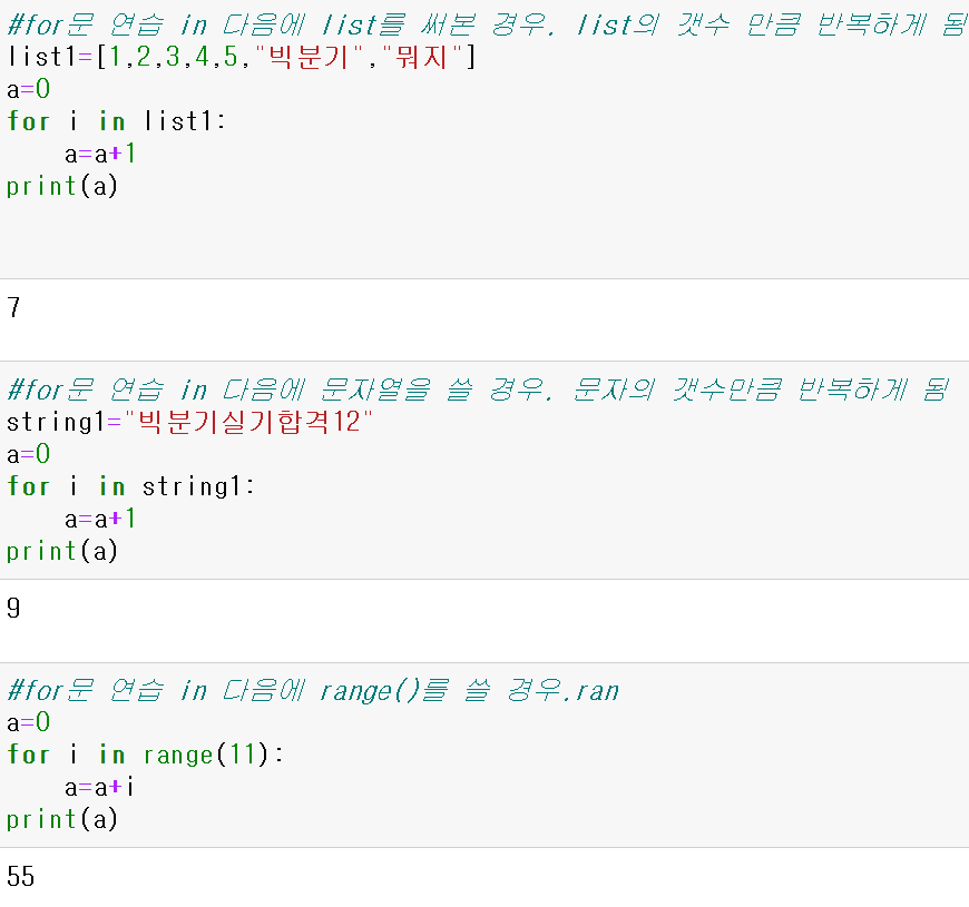 for 변수* in 리스트/튜플/문자열**