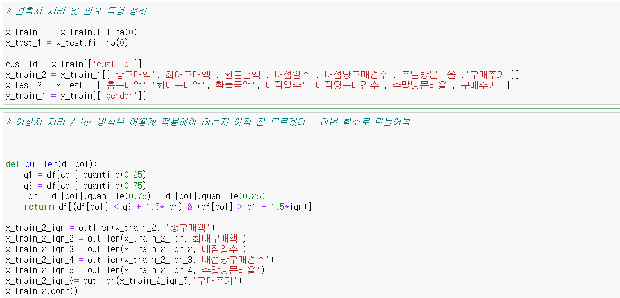 x특성치와 y레이블을 정함. 이상치를 제거해보고싶어서 야매로 주먹구구 코드를 짜봄.